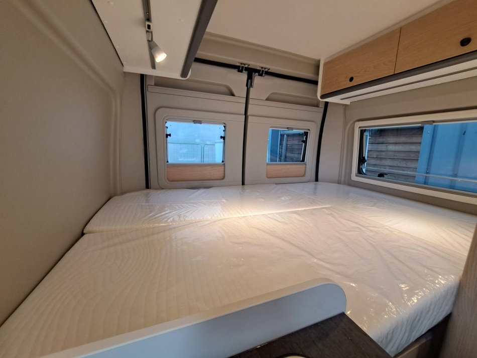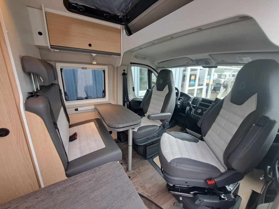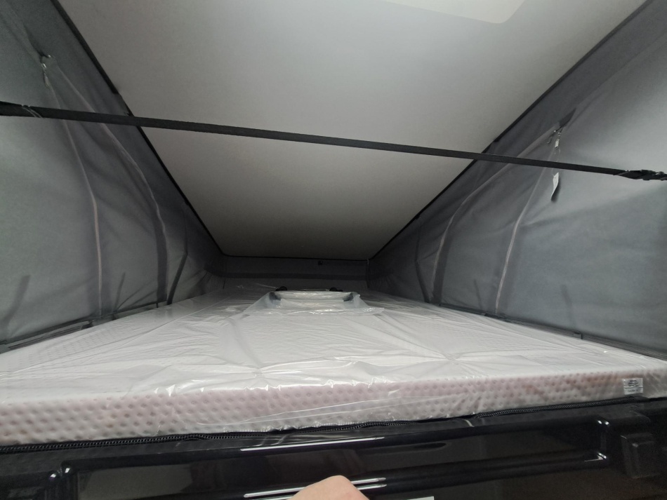 Partie avant de la toile du toit relevable complètement ouvrante avec moustiquaire l Liseuses LED l Ports USB l Matelas de grande qualité l Lanterneau de série Hauteur hors-tout (toit relevable fermé) : 281 cm