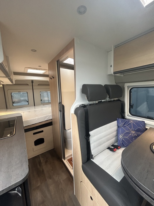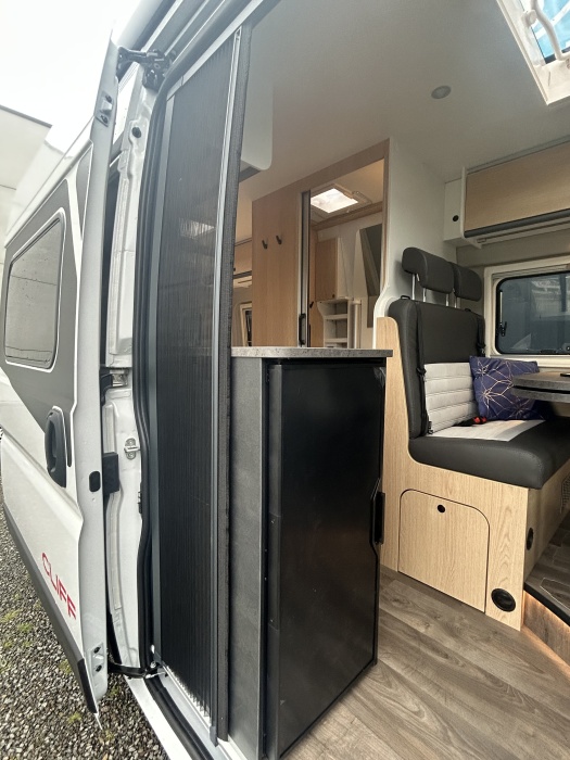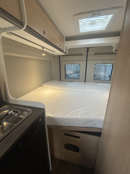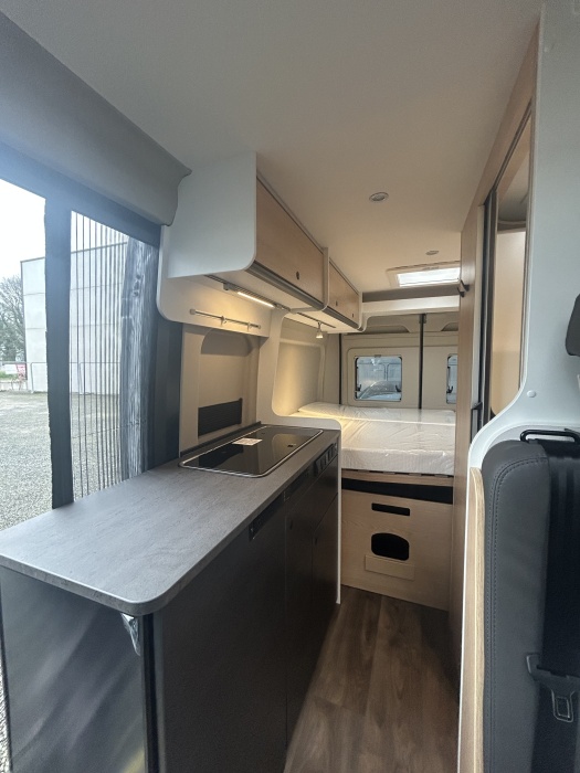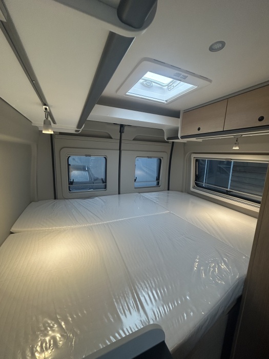 Le modèle grand luxe parmi nos camper vans : le CLIFF X est doté d'un mobilier de très grande qualité, d'un cabinet de toilette vario et d'une baie panoramique. Il est également possible de rajouter un toit relevable en option !